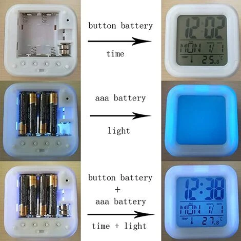 Alimentation: 4 piles AAA (non incluses) ou câbles de données USB (inclus). L’horloge d’alarme est équipée de 2 boutons rl44 pour afficher l’heure, la semaine, la date, la température, la fonction de l’horloge d’alarme, etc. L’éclairage et les lumières colorées sont alimentés par quatre piles AAA ou câbles de données.