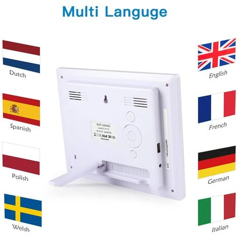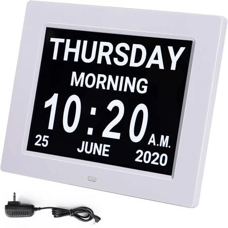 CARACTéRISTIQUES PRINCIPALES:Cette horloge numérique et calendaire haute résolution unique de 21?cm affiche clairement la Heure, jour de la semaine, mois et date en lettres majuscules claires – sans abréviations confuses. L’affichage de l’heure peut être réglé au format 12h ou 24h selon vos besoins.