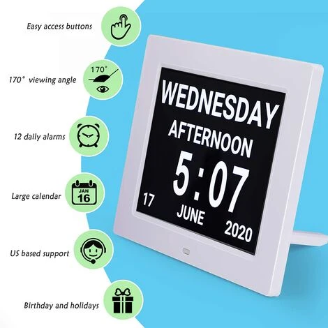 CADEAU PARFAIT :Les mots Alzheimer, démence ou perte de mémoire ne sont intentionnellement pas inclus sur l’emballage. Par conséquent, le jour du calendrier numérique peut être parfaitement distribué. Montre idéale pour les personnes de tous ages ! C’est donc un excellent cadeau pour ces êtres chers, en particulier grand-mère et amp; Grand-père.Tous les utilisateurs sont très utiles pour les personnes agées pour les repas quotidiens ou pour les médicaments.