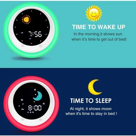 COMMENT ÇA FONCTIONNE】 L’icône de la lune et du soleil apprendra aux enfants quand il est temps de dormir ou de se réveiller : définissez 2 alarmes distinctes à l’heure du sommeil et du réveil. Le matin, il affiche l’icône du soleil et le vert lorsqu’il