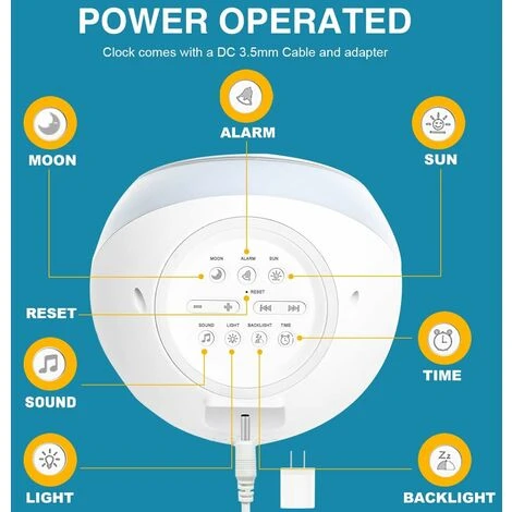 Vous pouvez choisir parmi 17 sons et 10 couleurs lumineuses pour configurer l’alarme de votre enfant. Caractéristiques snooze, format 12/24 heures, volume réglable et verrouillage enfant. Si vous avez des questions, n’hésitez pas à contacter notre service.