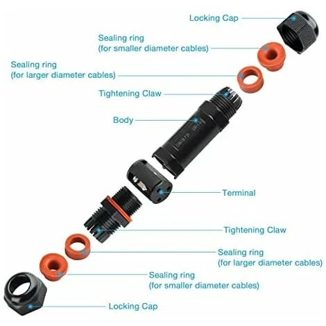 Applicable aux câbles électriques à 3 conducteurs avec des conducteurs de 0 à 2,5 mm². Plage de diamètre de câble compatible : Ø 2 – 13mm. L’anneau en caoutchouc le plus à l’intérieur peut être retiré pour s’adapter aux câbles de grand diamètre.